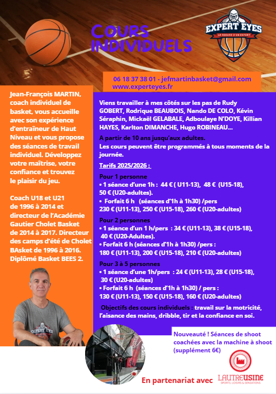 Après avoir enseigné 21 ans dans le cadre de l'Académie Gautier Cholet Basket, je mets mon expérience au service de tous les joueurs et joueuses.