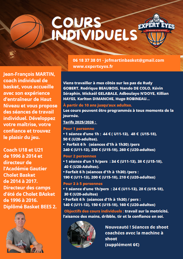 Après avoir enseigné 21 ans dans le cadre de l'Académie Pitch Cholet Basket, je mets mon expérience au service de tous les joueurs et joueuses.